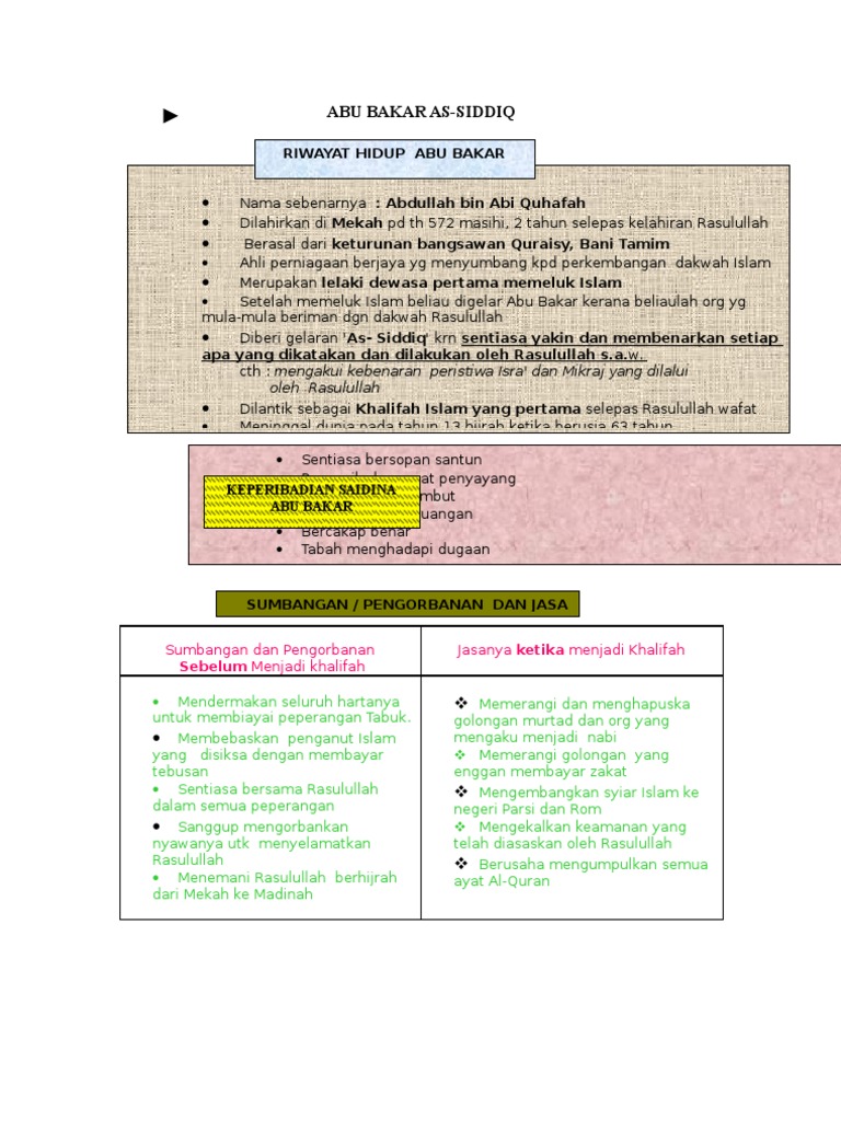 Sumbangan Abu Bakar As Siddiq - Bab 29 Abu Bakar As Siddiq R A Ppt Download / Menurut ahmad yaakob (2017), sumbangan khalifah abu bakar yang membantu dalam mendapatkan keamanan bagi umat islam adalah dengan menangani ancaman musuh seperti kerajaan byzantine (rom timur) di sebelah barat dan kerajaan parsi di timur.. Namun beliau selalu digelar abu bakar (daripada perkataan arab bakar yang bermaksud unta muda) kerana beliau amat gemar membiak unta. Masalah orang murtad yang mengambil kesempatan untuk menghancurkan keamanan dan perpaduan umat islam. More images for sumbangan abu bakar as siddiq » Hijrah rasulullah saw menuju destinasi baru, kota yathrib (madinah) melalui pelbagai cabaran termasuk dikejar dan diancam pihak musuh musyrikin makkah. Panggilan abu bakar ini sebenarnya gelaran bagi beliau, bukan nama sebenar beliau.